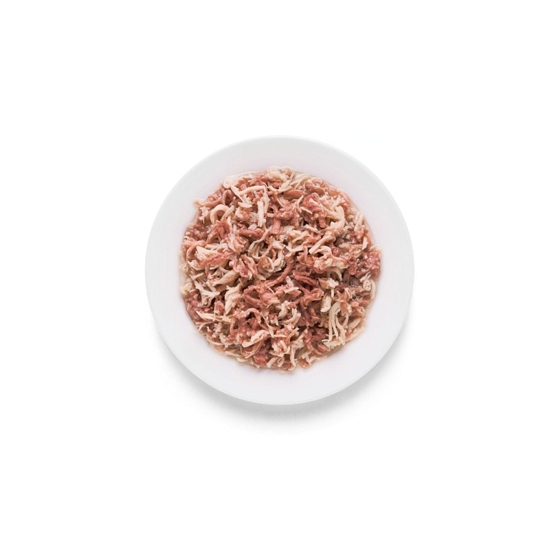Ingredients: Chicken fillet 65%, duck fillet 10%, potato 1%, broth 24%, crude protein 17%, crude fat 0.1%, crude fiber 0.2%, crude ash 1%, moisture 81.7%