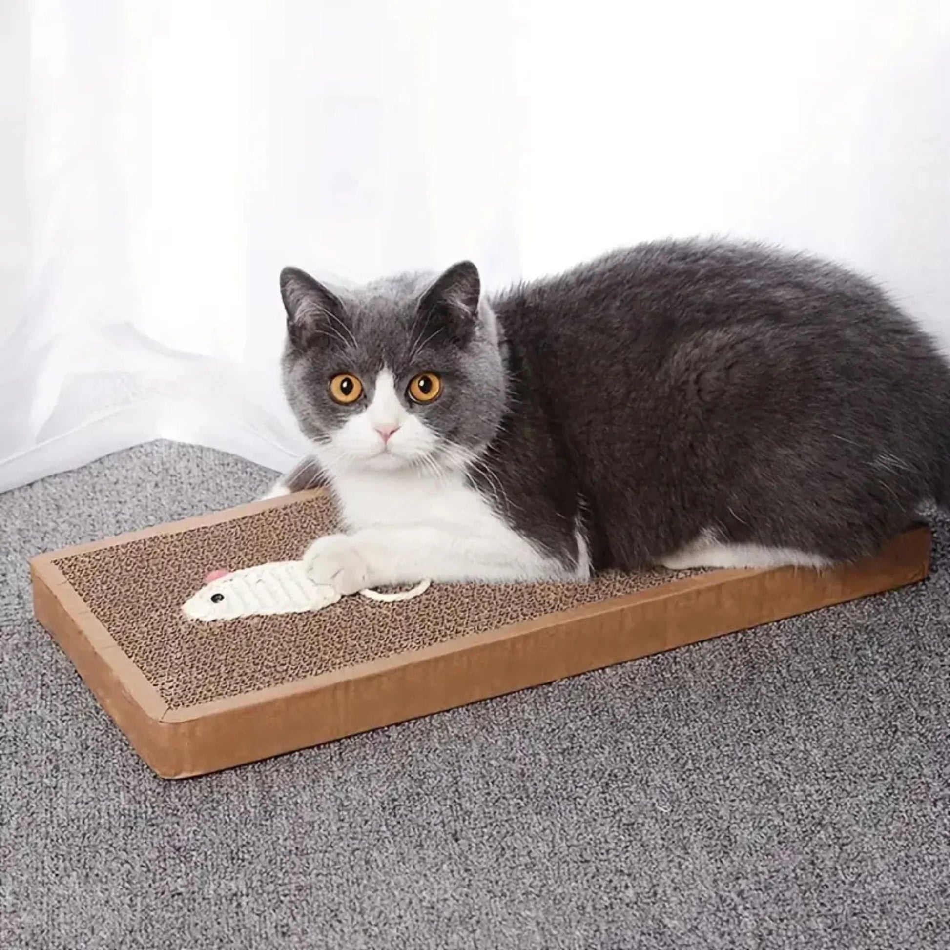 משטח גירוד שטוח ואיכותי לחתולים, עשוי קרטון גלי עבה עם צפיפות גבוהה, כולל עיטור עכבר חמוד שמעודד גירוד ומשחק. המשטח מתאים לגירוד טבעי של הציפורניים תוך שמירה על רהיטי הבית, מספק פעילות יומיומית לחתולים משועממים או מלאי אנרגיה. עיצוב שטוח ונוח להנחה על הרצפה או ליד מיטת החתול. מתאים לחתולים מכל הגילאים – גורים, בוגרים ומבוגרים. מוצר עמיד ובטוח, שאינו מתפורר בקלות ומספק שעות של גירוד מהנה.
