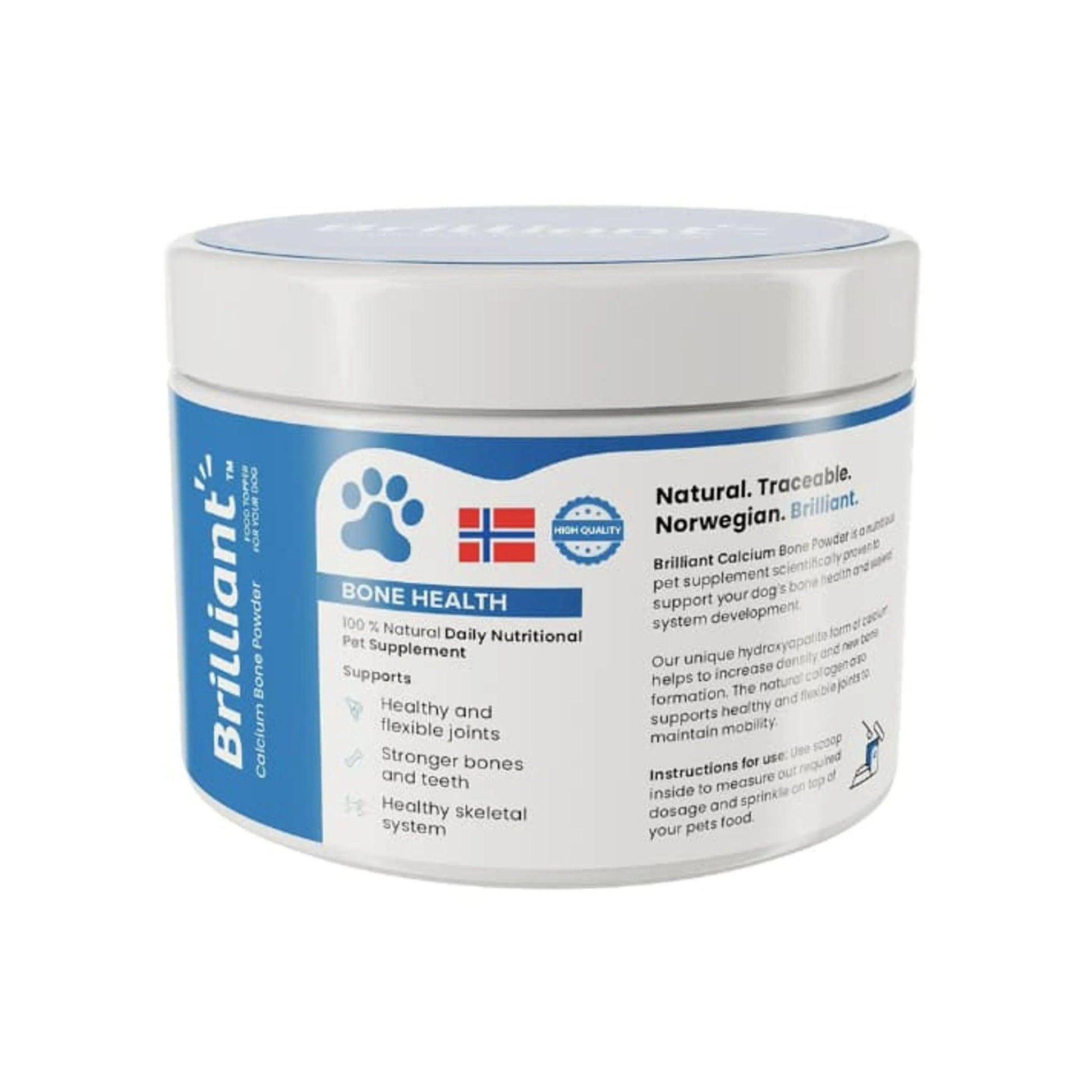 תוסף תזונה איכותי מבית Brilliant לחיזוק העצמות והמפרקים לכלבים – אבקה טבעית המופקת מ-100% עצמות דג סלמון, עשירה בסידן טבעי וקלוגן סוג II, החיוניים לתמיכה במערכת השלד, בהפחתת כאבים ובשיפור התנועתיות. מומלץ במיוחד לכלבים מבוגרים או מגזעים עם נטייה לבעיות מפרקים כמו לברדור, גולדן ורועים גרמניים. מתאים גם לחתולים. בעל טעימות גבוהה – ניתן לפזר על המזון או להגיש על משטח ליקוק, ואף משפר את טעמו של המזון. נבדק קלינית ומומלץ ע”י וטרינרים, פתרון טבעי ואפקטיבי לתמיכה בבריאות העצמות והמפרקים.