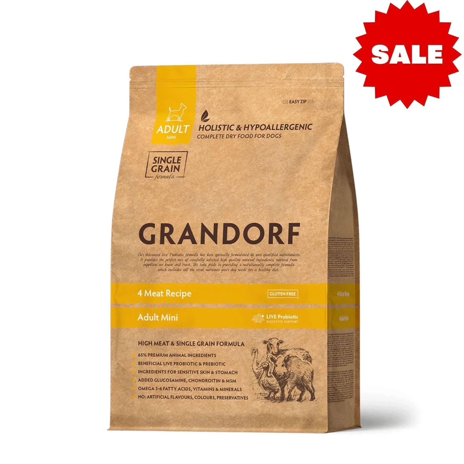 GRANDORF 4 Meat Mini גרנדורף מיני 4 סוגי בשר לכלב בוגר גזע קטן 8 ק״ג היפואלרגני