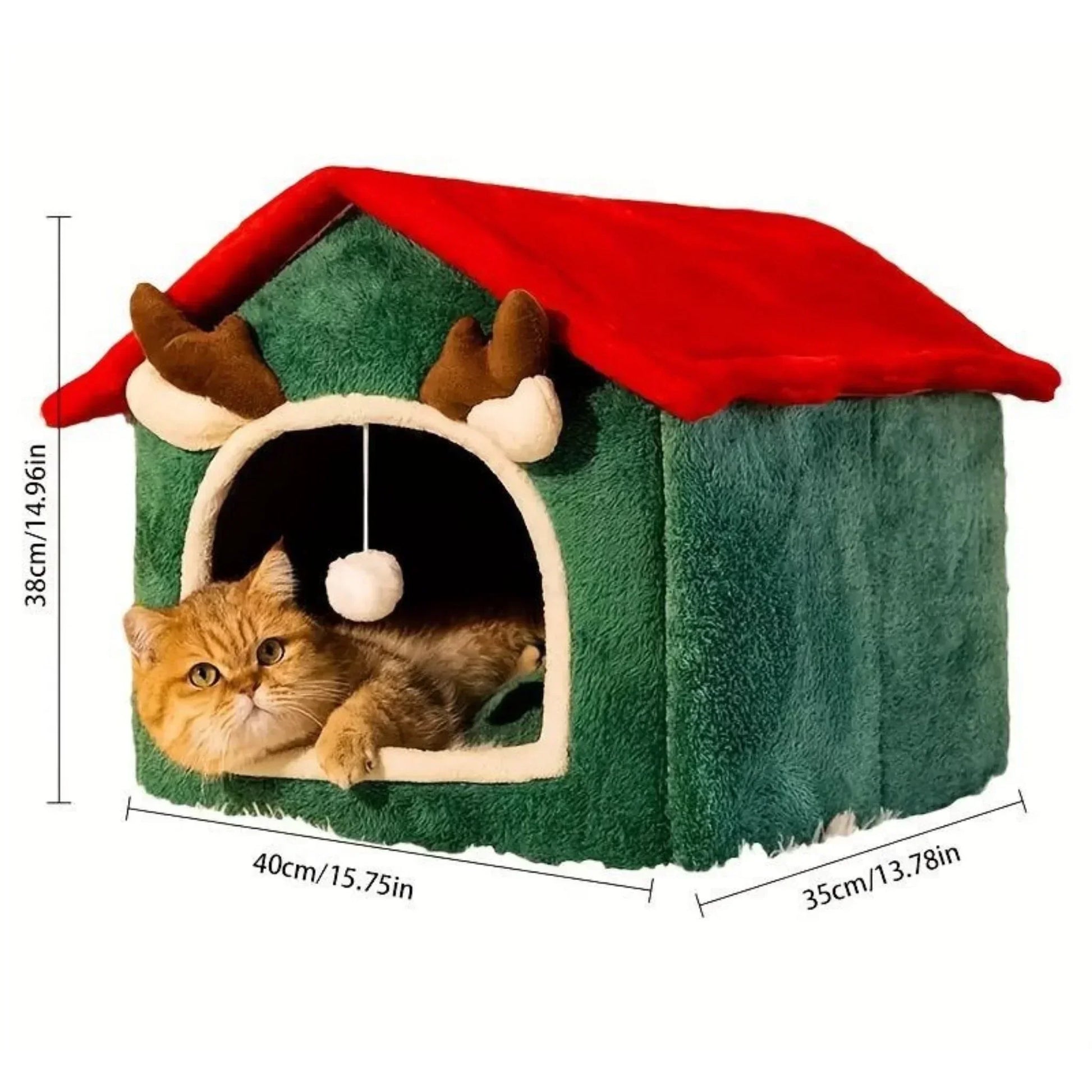 המיטה עשויה מבד פליז רך ונעים, עם גג אדום וקרניים קטנות בעיצוב חגיגי שמכניס אווירה של חום וביתיות בעונת החורף.