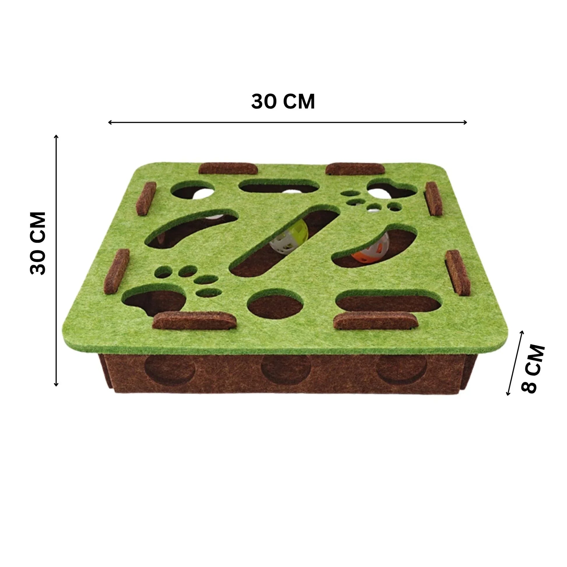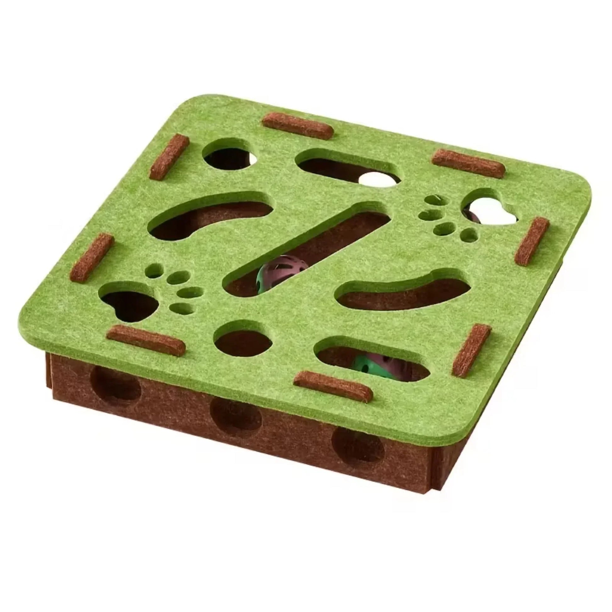 הצעצוע כולל מבוך מרובע עם פתחים בצורות שונות וכדורים זזים בפנים, המעודדים את החתול להשתמש בכפותיו כדי להזיז ולתפוס אותם.