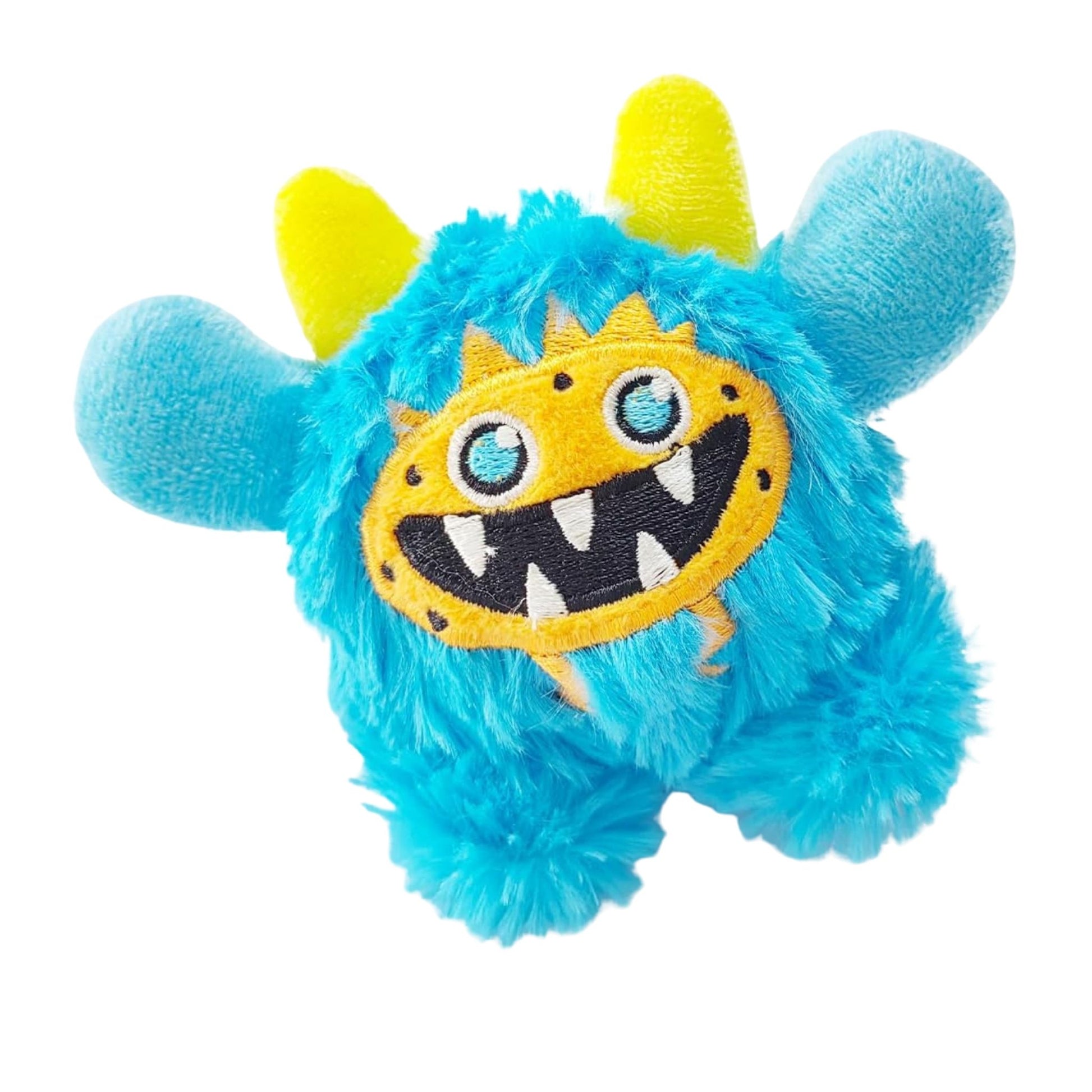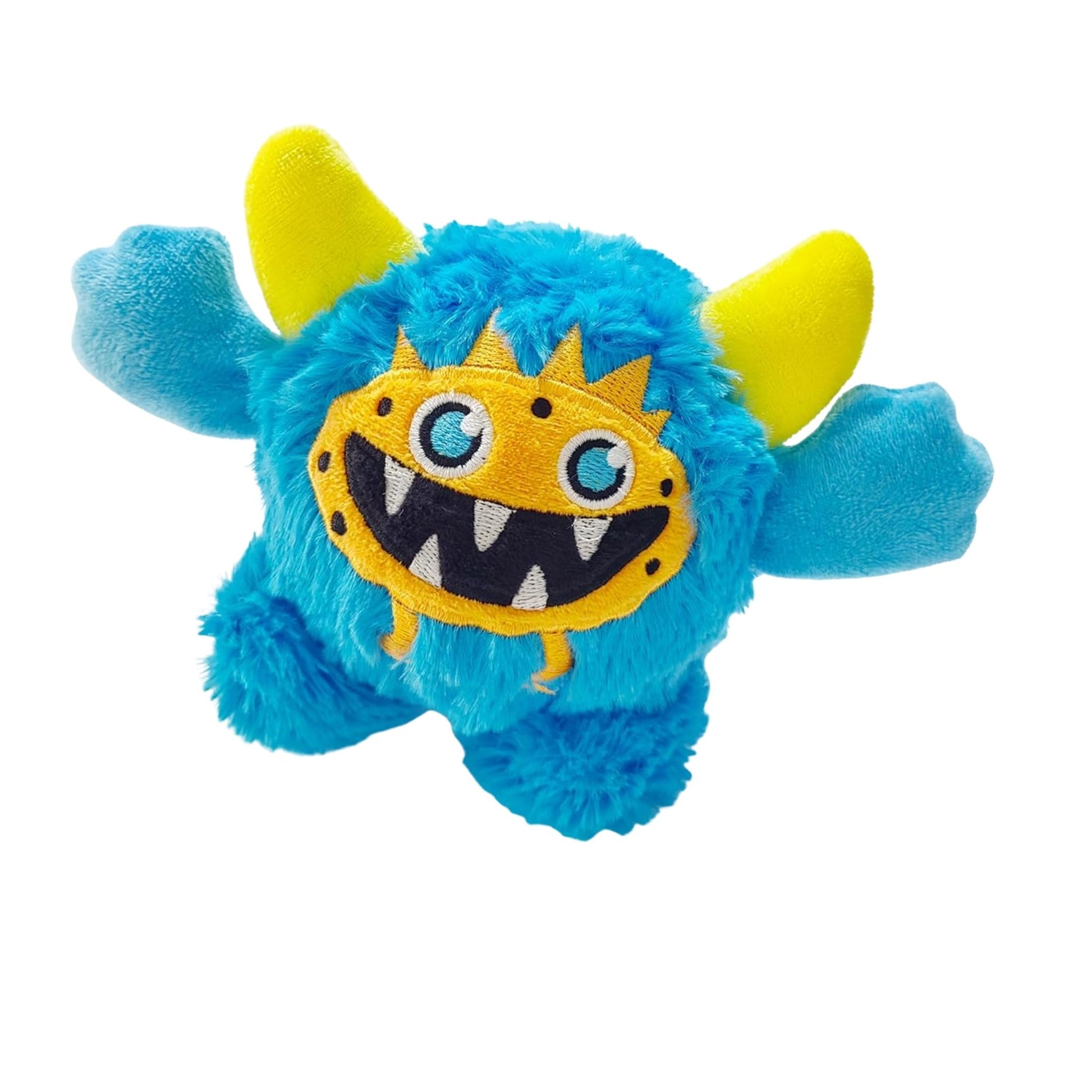 צעצוע מצחיק ומהנה לכלבים בצורת מפלצת כחולה עם קרניים צהובות!