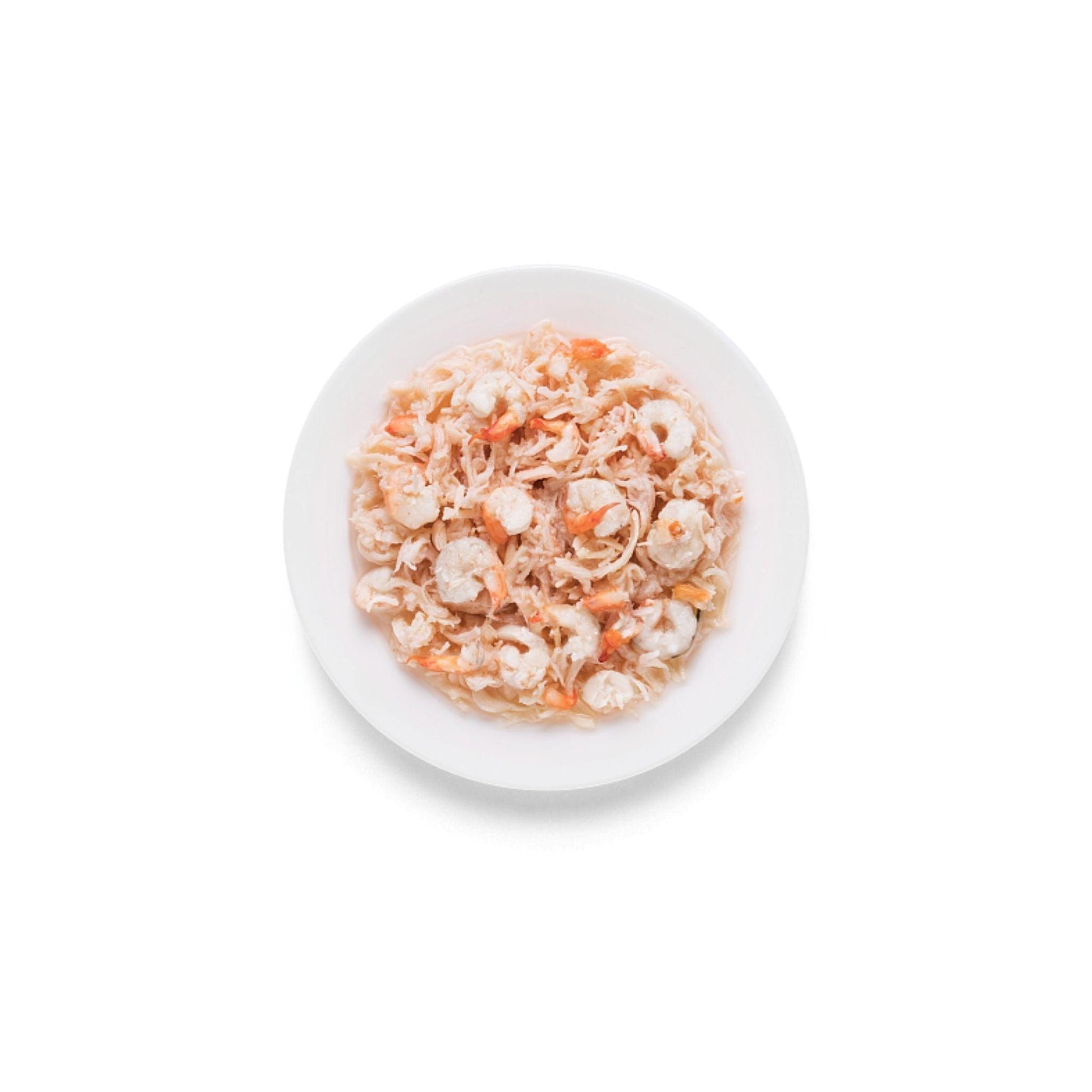 Консервированная куриная грудка и деликатес из креветок, полноценный корм на 75% состоящий из мяса для взрослых кошек. Гипоаллергенный влажный корм для кошек, натуральное и здоровое питание без зерновых и глютена, благодаря чему лакомство обогащено витаминами. Подходит для кошек с проблемами пищеварения.