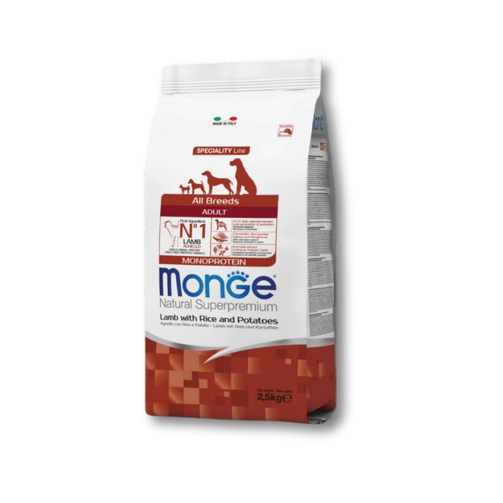 Monge Natural Superpremium Monoprotein All Breeds Adult Lamb with Rice and Potato  Ягненок для взрослой собаки 2,5 кг — это полнорационный корм для домашних животных, предназначенный для взрослых собак всех размеров и предлагающий тщательно разработанную формулу для оптимального здоровья. Изготовленный в Италии и разработанный с использованием высококачественных питательных веществ, этот корм содержит источник животного белка, основным ингредиентом которого является баранина, что обеспечивает высокую усвояемость и восхитительный вкус благодаря сочетанию свежего мяса. Рецепт дополнительно обогащен усовершенствованным пребиотиком XOS (ксилоолигосахаридом) для улучшения здоровья кишечника, а также растительными ингредиентами и экстрактами, такими как корень эхинацеи, орегано, чеснок и экстракт артишока. Кроме того, в состав входят глюкозамин и хондроитинсульфат для поддержки суставов и костей. В состав корма не входят искусственные красители и консерванты, что обеспечивает натуральное и сбалансированное питание для вашей собаки.