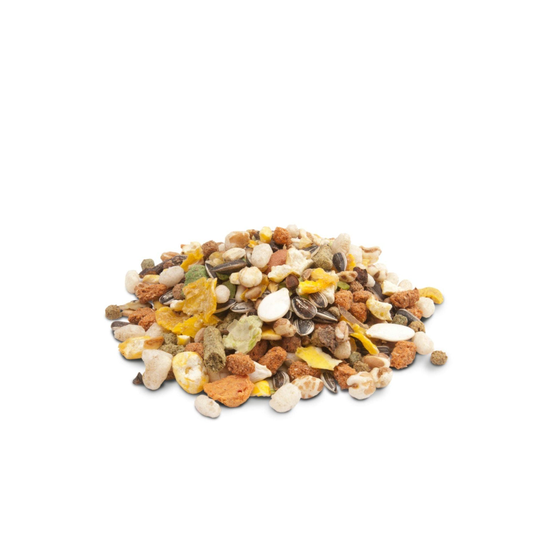 Кукурузные хлопья, гороховые хлопья, кубики рожкового дерева, ячмень, пшеница, гречка, семена подсолнечника, горох, очищенный арахис, морковь, фасоль, овощи, витаминный концентрат.