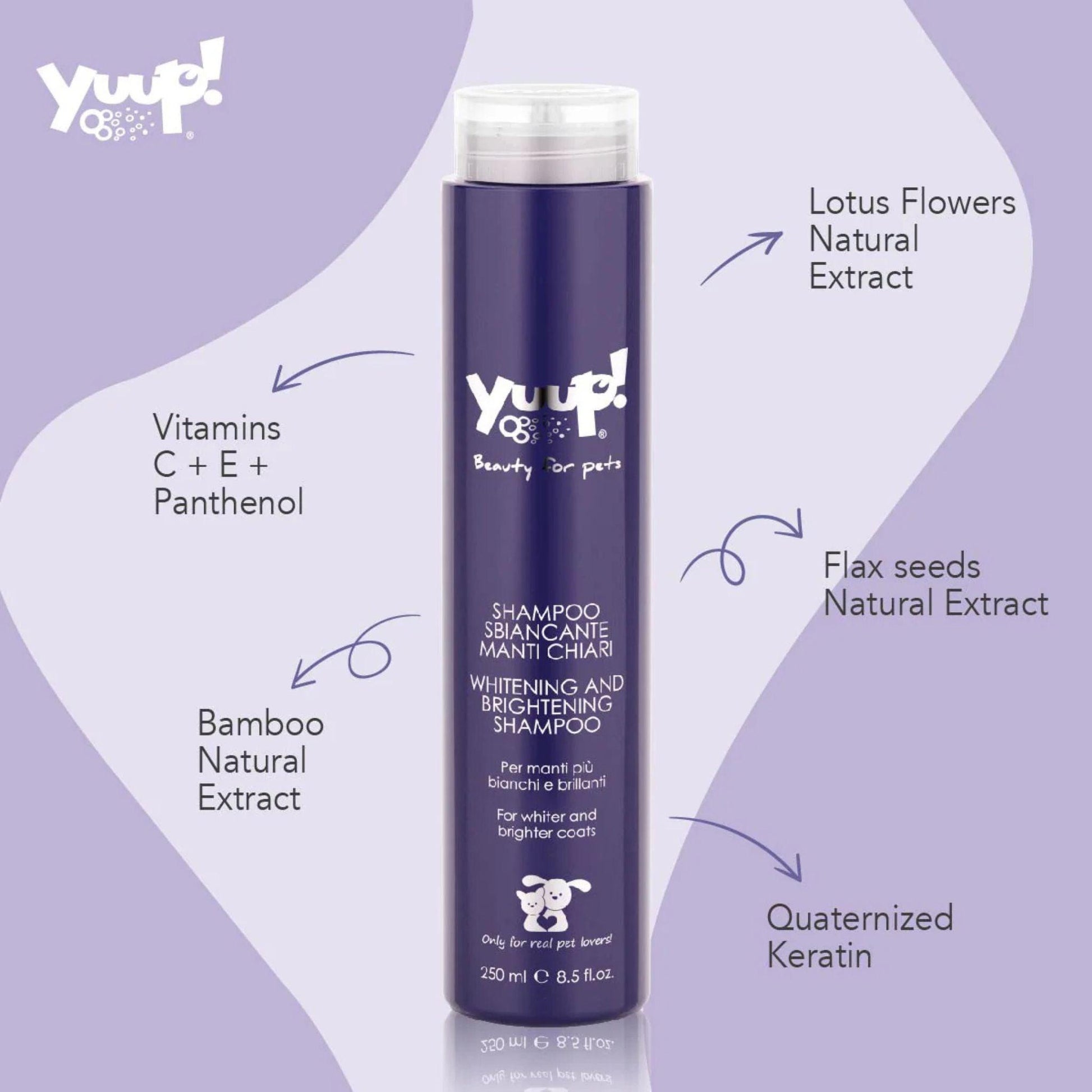 Шампунь Yuup для собак и кошек с белой шерстью, 250 мл. Уникальная формула, которая тщательно очищает, осветляет и восстанавливает естественный блеск белого меха. Шампунь обогащен кератином, витамином С, витамином Е, пантенолом, натуральным экстрактом алоэ вера, маслом крапивы и солодки — натуральными и нежными компонентами, которые обеспечивают идеальный уход за нежной шерстью и сохраняют ее белый и блестящий цвет в течение длительного времени.